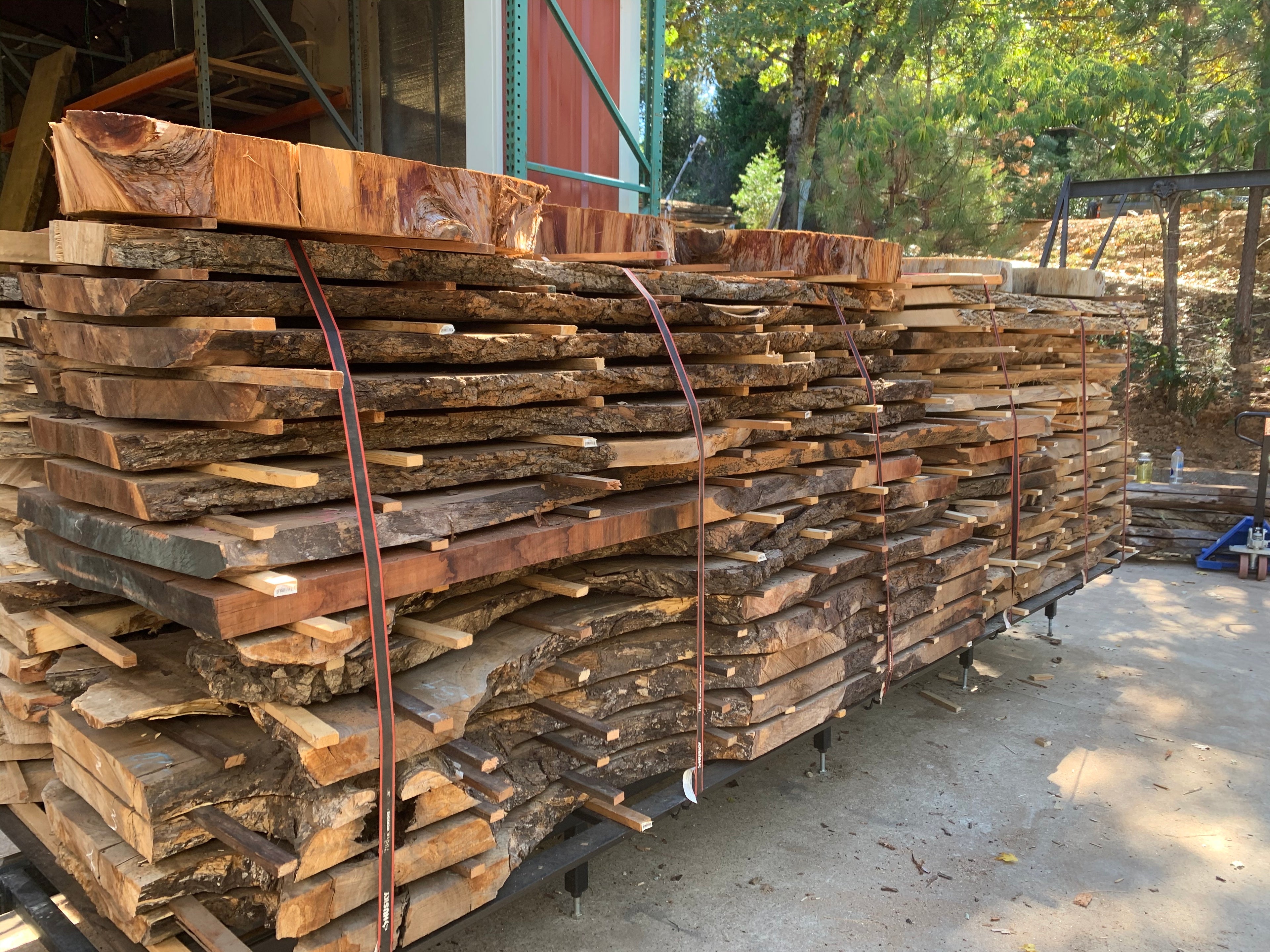 Our lumberyard is stocked with a wide variety of hardwoods and softwoods, such as walnut (Black, Claro, English), oak, redwood, sequoia, sycamore, cottonwood, birch, buckeye, cherry, pine, and cedar. We can supply you with live edge slabs, burl cookies, dimensional lumber, and custom wood pieces at various stages of drying and finishing.